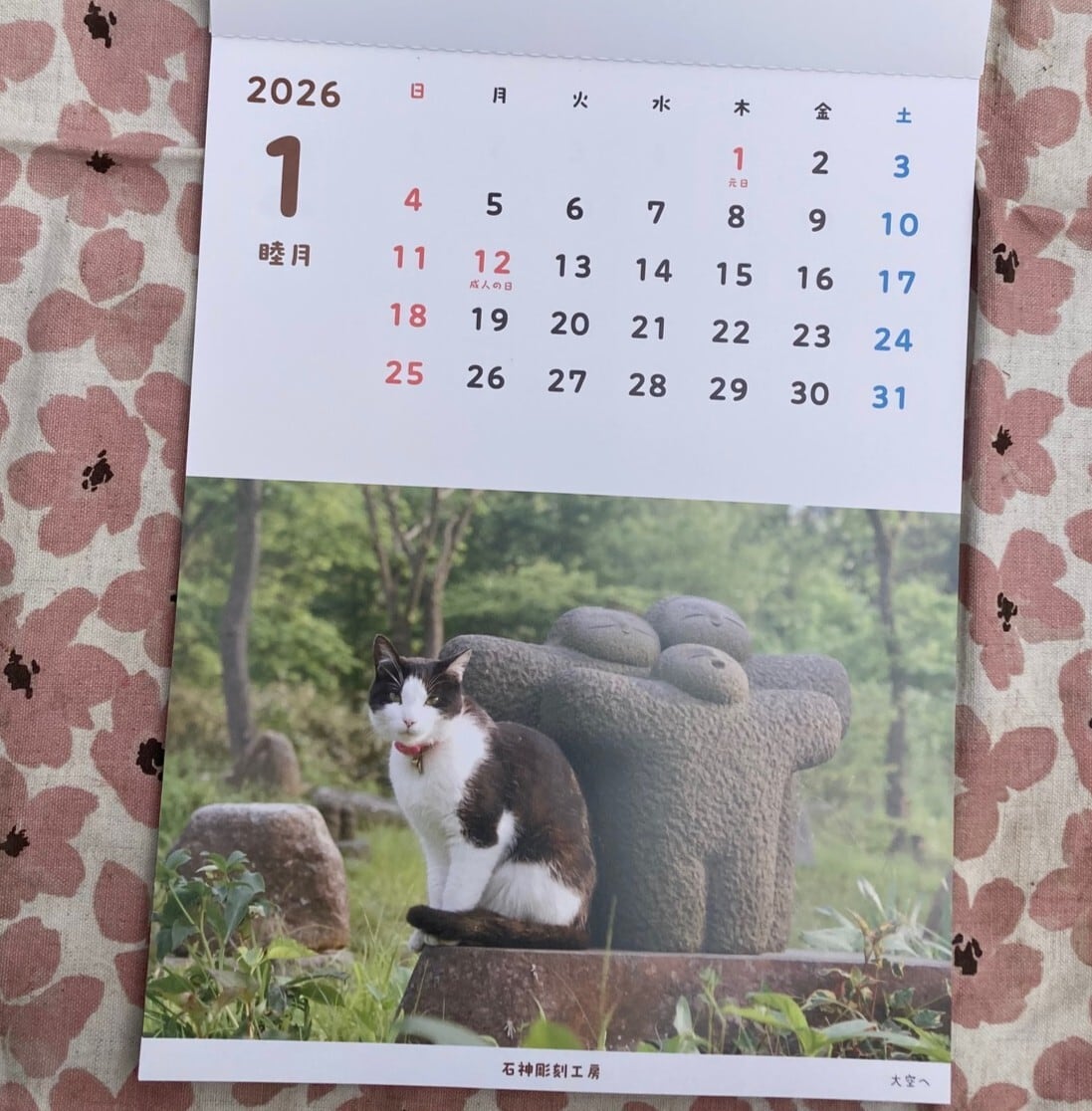 工房の看板猫モモコが2025年1月に亡くなりました。モモコをしのんで感謝の意味を込めて、1月には元気だった頃のモモコを登場させました。一緒に写っている石の彫刻の作品名が「大空へ」です。